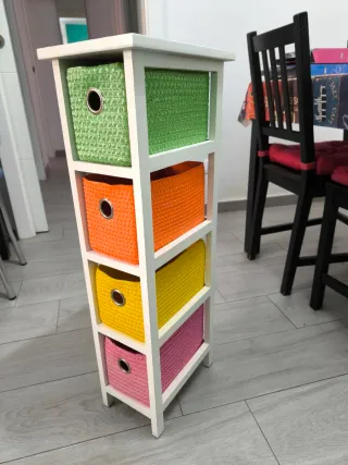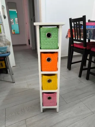Cajonera estrecha con cuatro cestas de mimbre de diferentes colores. - Estructura de madera. - Cestas de mimbre con asas redondas. - 78cm de alto / 20cm de ancho balda superior y 17 cm de ancho estructura de cajones / 30cm de profundo balda superior y 27cm de profundo estructura de cajones. Dimensiones de cestas: 14cm de alto / 11cm de ancho / 23cm de profundo. - En general el mueble ha tenido bastante uso pero se conserva de manera aceptable. Como pueden ver en la foto de la balda superior, se aprecia el desgaste y las imperfecciones que pueda tener para que lo valoren. - Ideal para un baño y zonas estrechas.