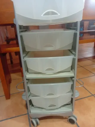 Práctica cajonera con ruedas, ideal para organizar tu espacio de trabajo. - Estructura de plástico resistente. - Cajones transparentes para fácil visualización. - Ruedas para movilidad. - Diseño moderno en color gris.
