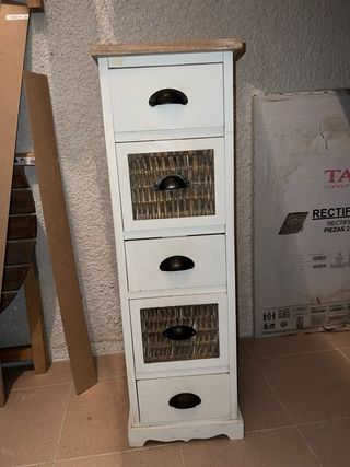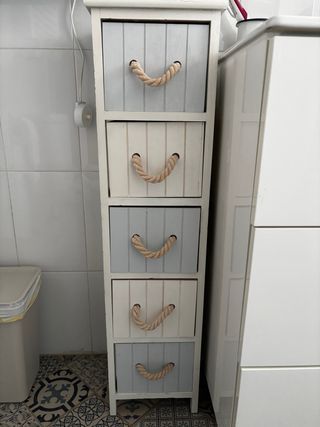 Práctica cajonera de baño con un diseño encantador. - Estructura de madera y tiradores de cuerda. - Combinación de colores azul y blanco. - 5 cajones perfectos para almacenaje complementario. Tiene una pequeña grieta por la humedad de la que adjunto foto