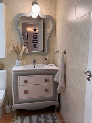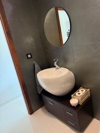 Mueble de baño, lavabo y espejo. No incluye el grifo. Alguna marca de uso el mueble y la madera un pelín engodada en un par de sitios, pero en general está todo muy bien!! El lavabo no es de cerámica, tiene el seno desplazado a la izquierda, lo que deja una pequeña encimera para dejar cosas a la derecha. Incluye escuadras para colgar. El mueble es una cajonera de Ikea que se llama Hjälpa, también en blanco mate y le hemos colocado ruegas para facilitar la limpieza. El espejo es de madera, diseño estilo nórdico. Vendo también por separado: lavabo 70€, espejo 40€, cajonera 90€. Medidas lavabo: 80.5 x 46 x 11.5 cm. Cajonera: