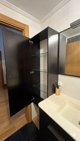 Mueble auxiliar para baño, ideal para espacios reducidos. - Diseño vertical y estrecho. - Combina madera y cristal. - estanterias interior de cristal