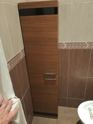 Mueble auxiliar de baño con un diseño alto y estrecho, perfecto para aprovechar espacios. - Acabado en madera oscura. - Cuenta con dos puertas y un cajón. En las fotos se puede apreciar una mancha de pintauñas yde pegamento del adhesivo del embalaje