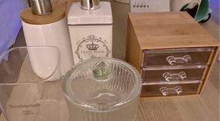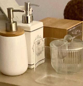 Conjunto de 3 (+!1) piezas para el baño. - Dispensador de jabón con tapa - Dispensador de jabón corona (va de regalo) - algodonera o frasco para guardar salles de baño, de cristal con tapa. - Porta cepillos de cristal. (La cajonera de la foto no: ya fue vendida)