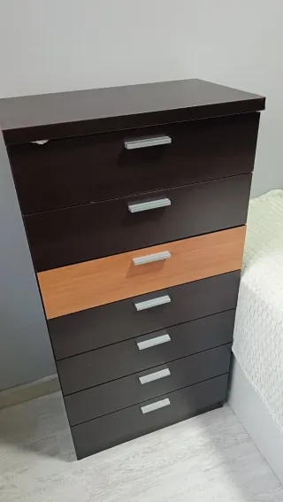 Cómoda alta con un diseño moderno y funcional. - Siete cajones espaciosos. - Combinación de colores marrón y madera. - Tiradores metálicos plateados. Está en perfecto estado, en las fotos se aprecian 2 desperfectos , pero está como nueva . Medidas Ancho 60 cm Fondo 36 cm Alto 119.50 cm . Recogida en Madrid zona sur Palabras gancho: casa mobiliario muebles cama armario cómoda mesilla baño habitación cocina electrodomésticos electrónica salón vivienda lamparas sofá mesa sillas puerta ventana sanitarios