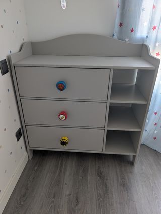 Cómoda infantil modelo TRÜGEN de IKEA, en color gris. Dispone de 3 cajones amplios + 2 baldas abiertas para juguetes (3 huecos), libros o ropa. Personalizada con tiradores pintados a mano de superhéroes (Superman, Flash y Batman). Está en buen estado, con uso normal (se pueden cambiar los tiradores fácilmente si se quiere un estilo más neutro). Tiene un pequeño desperfecto como se ve en la imagen. 📏 Medidas aprox.: 100 cm alto x 100 cm ancho x 42 cm fondo. 👉 Ideal para habitación infantil. Se entrega montada y lista para usar.