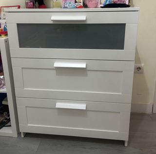 Dos cómodas BRIMNES de Ikea en color marron oscuro. Están en muy buen estado y son perfectas para cualquier dormitorio. - Tienen 4 cajones cada una. - Un cajón superior con puerta de cristal. - Ideales para guardar ropa y otros objetos.