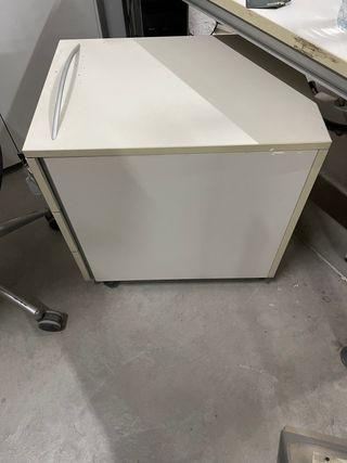 Cajonera con ruedas, con cajones metálicos, estructura de melamina con cerradura y tres cajones. Tengo varias ud. Y mesas de despacho. Son de marca de mobiliario de oficina profesional. Precio de compra inicial fue de 240€/ ud.