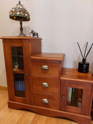 Mueble auxiliar de madera con un diseño clásico y funcional. Cuenta con dos puertas superiores y tres cajones inferiores. - Puertas con tiradores metálicos. - Cajones con tiradores metálicos. - Acabado en madera natural.