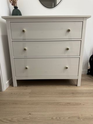 Cómoda de tres cajones de Ikea. Diseño moderno y funcional. - Tiradores decorativos. - Acabado en color blanco y beige.