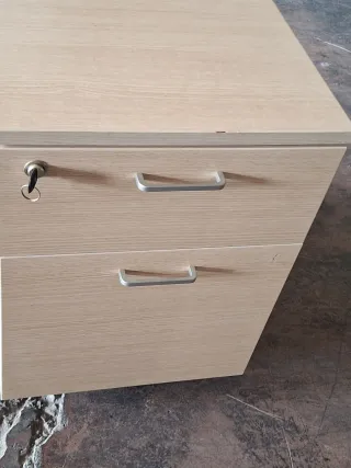 Conjunto de mesa y cajonera para oficina. El mueble principal es una mesa espaciosa con un diseño moderno. - Cajonera de tres cajones. - Acabado en tonos beige y gris.