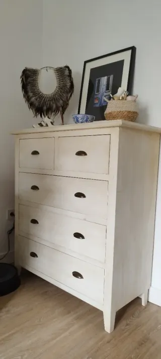 Mueble tipo cómoda de madera en color blanco. Cuenta con varios cajones para almacenamiento. En perfecto estado. 6 cajones, muy amplio. Madera maciza. Cajones de cierre suave. Se vende montado. Te ahorras el montaje. Precio original 300€. Ancho 108cm fondo 50cm altura 131 cm fondo de cajón (int) 43cm - Diseño de líneas rectas. - Tiradores metálicos. Muy bien cuidado
