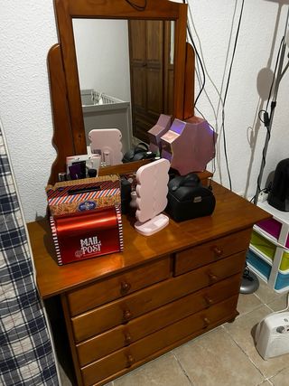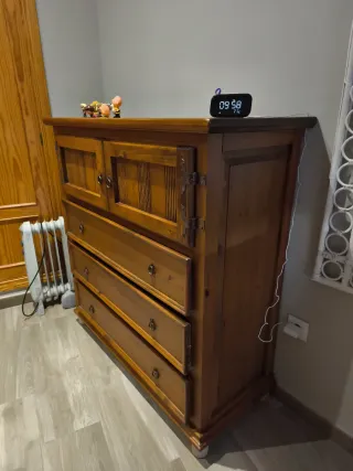 Mueble de madera con varios cajones y un compartimento. - Diseño clásico y vintage. - Acabado en tono madera natural. Mas antiguo que la guerra, pero hace su funcion perfectamente.