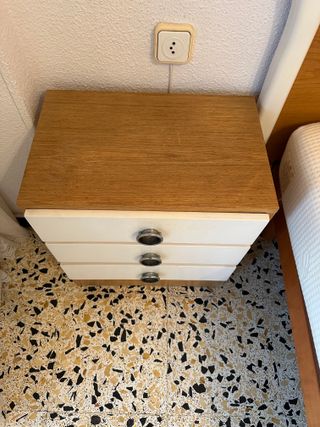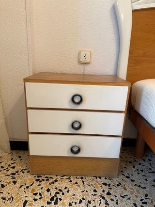 Conjunto de dos mesitas de noche o cajoneras. - Diseño moderno con combinación de colores. - Acabado superior en madera. - Cajones frontales en blanco. Usada, en buen estado general. Se aprecian ligeras marcas normales de uso, nada estructural.