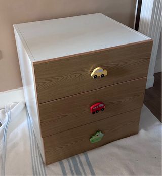 Cajonera de madera con un diseño divertido y original, perfecta para habitaciones infantiles. Cuenta con tres cajones con correderas metálicas de extracción total y cada uno tiene un tirador temático. - Tirador con forma de coche amarillo. - Tirador con forma de autobús rojo. - Tirador con forma de barco verde. Nota: los tiradores se pueden sustituir.