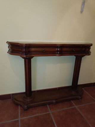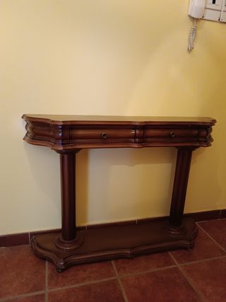 Mueble de entrada de madera con dos cajones. Color marrón. En muy buen estado solamente tiene saltadas algunas zonas pequeñas como aparecen las últimas fotografías. Las medidas aparecen en las fotos. No se hacen envíos, se recoge en Almendralejo. Precio económico.