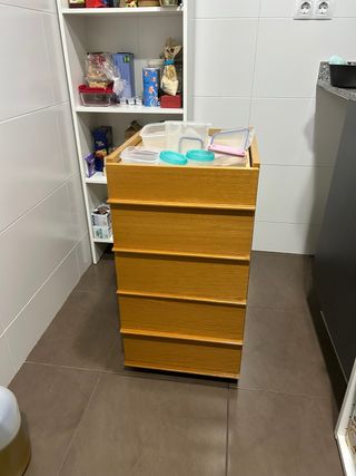 Mueble de almacenaje con cajones de madera. - Diseño de líneas sencillas. - Acabado en tono madera natural. Ideal para colocar debajo de alguna encimera o en una cocina. No tiene parte de arriba. Solo recogida