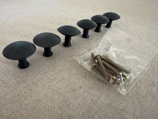Set de seis pomos metálicos para cajoneras o puertas de muebles. Color gris grafito. 30 mm de diámetro 30 mm de profundidad - Fáciles de instalar - Diseño redondo y elegante. - Incluye tornillos para su instalación.