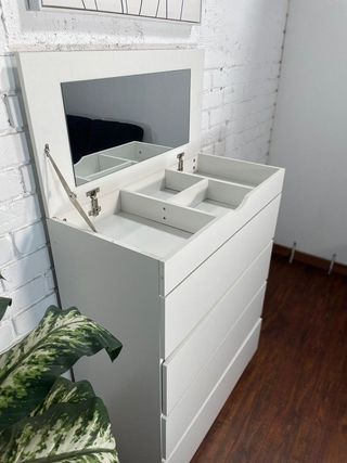 Mueble sinfonier blanco con espejo abatible y compartimentos organizadores. Los cuatro cajones proporcionan un amplio espacio para guardar ropa y accesorios. Muebles nuevos de fábrica y de fácil montaje. 🚛 Consúltanos precio de envío y montaje. 🛍️ Pago en el momento de la entrega, contra reembolso. 🎖️ Garantía de 2 años.