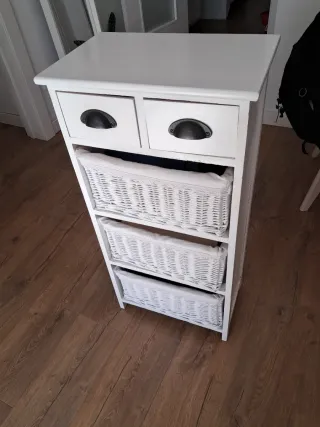 Mueble auxiliar con dos cajones y tres cestas de mimbre. Altura 85cm Ancho 42cm Fondo 27cm - Diseño práctico y decorativo. - Acabado en blanco.
