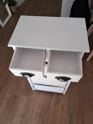 Mueble auxiliar con dos cajones. 40 cm (profundidad) x 35 cm (ancho) x 50 cm alto. Diseño sencillo y color neutro la hacen versátil para cualquier estancia. - Acabado en blanco. - Estructura de madera y plástico.