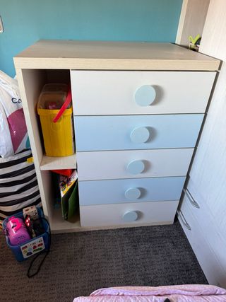 Cajonera de diseño moderno con cinco cajones, ideal para habitaciones infantiles. Combina acabados en blanco y azul. - Tiradores redondos. - Estructura de madera