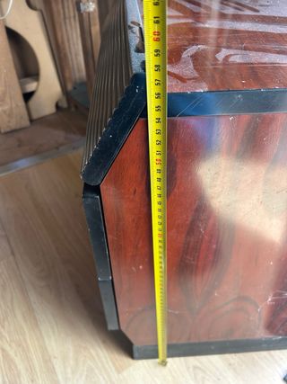 Mueble cajonera de madera con un acabado brillante. - Diseño moderno con líneas curvas y detalles en negro. - Amplio espacio de almacenamiento. - Estructura robusta. - Tiene algun que otro desperfecto como se muestra en la imagen - Pesa bastante por lo que si o si deben haber dos personas presentes minimo - Son dos piezas separadas, la de arriba se puede separar, son totalmente independientes - Faltan todos los tiradores de los cajones Preguntar por medidas