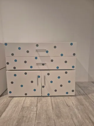 Cajonera blanca con un diseño divertido de puntos. - Diseño con puntos azules y grises. - Fabricada en madera y plástico. -Son 4 cajoneras, se pueden vender por separado (15 euros cada una ) o el pack de 4 (55 euros).