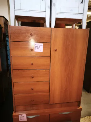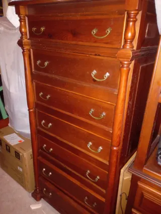 Mueble de madera con varios cajones, ideal para organizar tu ropa y accesorios. Medidas....65 ,alto...138 y fondo 40. - Diseño clásico y elegante. - Tiradores metálicos. - Acabado en tono marrón cálido.