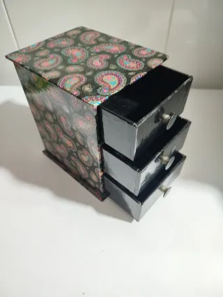 Pequeña cajonera con un diseño llamativo y colorido. Para habitación de niña Para guardar joyas o ganchos gomas de pelo ext....... - Tres cajones con tiradores. - Diseño de cachemir en tonos vibrantes.