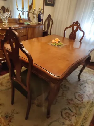 Conjunto de mesa y seis sillas, armario con espejo y vitrina de comedor de estilo vintage. -Mesa de comedor con superficie pulida(1,3x1m.)y patas talladas y curvas con posibilidad de ampliar el tamaño de la mesa (53cm por cada lado). 80€ -Seis sillas con respaldo tallado (118cm de alto) y tapizado verde suave de 47cm.de ancho. 150€ -Armario bajo con dos puertas en los laterales y cajonera en parte central (1,90x56x97), con espejo encima de 1,16cm. de alto. 170€ Posible comprar por separado.