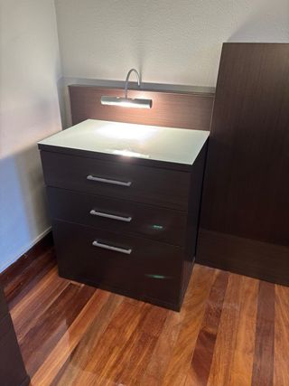 Conjunto de muebles de dormitorio. - Cabecero de cama con luz. - Dos mesitas de noche. - Cajonera de madera oscura. REGALO ESPEJO