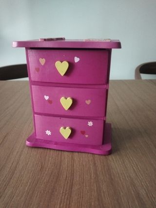 Joyero cajonera de madera " Friends" en color rosa fucsia y tiradores en forma de corazón de color amarillo.
