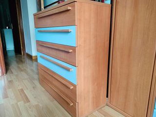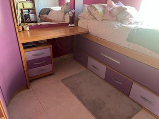 Habitación completa Cuenta con dos camas (90x190) con cajonera debajo, escritorio, cajonera con ruedas, estanteria, armario con estareria tanto dentro como fuera. Se puede ver en persona en Cáceres Desmontaje, transporte y montaje corre por cuenta del comprador. Se hacen envios atraves de empresa privada puesta por el comprador. *PRECIO NEGOCIABLE* Tengo otra habitación en tonos azules subida. Pregunta sin compromiso.