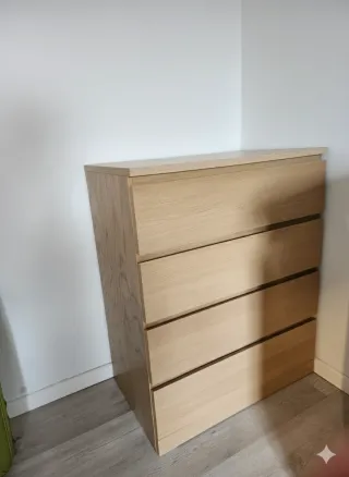 Cómoda de cuatro cajones con acabado en chapa de roble. Su diseño moderno y funcional la hace perfecta para cualquier habitación. - Cuatro cajones amplios para almacenamiento. - Acabado en chapa de roble. - Intacta, no tiene ningún desperfecto - Vendo por cambio de dormitorio - Nueva cuesta 109€