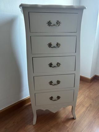 Preciosa cómoda de madera. Se encuentra en muy buen estado. - Lacada en blanco. - 4 cajones. - Perfecta para cualquier habitación. - Medidas 85x55x88 Se ayudaría con el transporte.