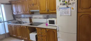 Conjunto de muebles de cocina en tonos madera. Incluye armarios superiores e inferiores y cajoneras. - Diseño clásico. - Tiradores metálicos.
