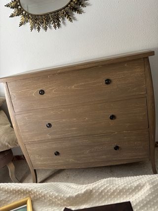Cómoda de madera con un diseño clásico y funcional. Perfecta para organizar tus pertenencias. Cómoda robusta en madera color nogal. Tiene 4 cajones grandes con tiradores metálicos. Muy buena capacidad de almacenaje. Estructura sólida, cajones funcionan bien. Presenta pequeño desperfecto estético en un cajón (ver foto), no afecta al uso. Ideal para dormitorio o vestidor. Venta rápida por mudanza. Recogida en mano. Precio ajustado. - Cuatro cajones amplios para almacenamiento. - Acabado en tono madera natural.