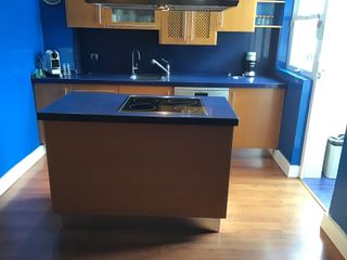 Conjunto de muebles de cocina que incluye: -Mueble alto de almacenaje. -Mueble alto para columna, horno y microondas. -Mueble alto para frigorífico. -Muebles bajos, incluido, uno de cajones. -Isla para vitrocerámica con Cajoneras grandes, puerta y cajón pequeño. -Muebles altos compuertas lisas, Dos compuertas de cristal y uno compuerta de celosía. -Todos los tiradores son de acero. El interior de los muebles se encuentra en perfecto estado. Nota: en las medidas he puesto solo las de los muebles bajos. Opción de comprar también encimera de silestones, azul y electrodomésticos: Horno, frigorífico, vitrocerámica, lavavajillas y cam