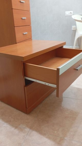 Conjunto de dos mesillas de noche y una cajonera a juego, perfectas para una habitación. Cada módulo 20€ - Diseño moderno y funcional. - Acabado en tonos madera cerezo - Combinación de materiales resistentes, buena calidad de madera - pequeños roces de uso pero bastante buen estado