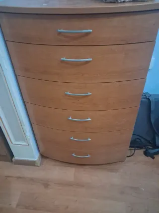 Conjunto de muebles de dormitorio que incluye una cajonera y dos mesitas de noche + mueble auxiliar televisión - Cajonera con cinco cajones. 30€ - Dos mesitas de noche a juego. 15€ cada una Mueble televisión 20€ Todo x 70€