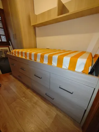 Muebles de madera color gris/beige, robustos y en buen estado. - Cama nido medidas 93cm alto X 202 cm largo X 100cm ancho. Para colchon de 90x190cm. - Cajonera con ruedas medidas 63cm alto X 40cm profundo X 45cm ancho. Se pueden comprar por separado. Solo recogidas, la cama hay que desmontarla.