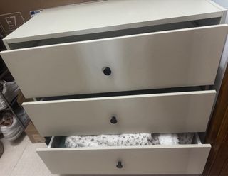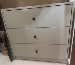 Cómoda de tres cajones con un diseño moderno y elegante. - Color beige neutro. - Tiradores redondos negros.