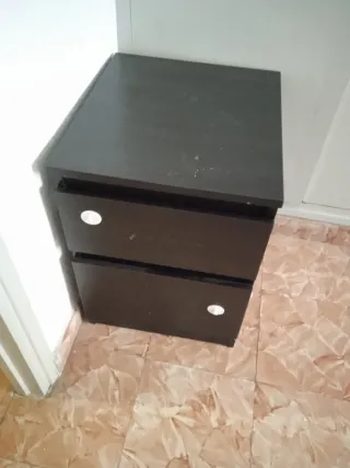 Mueble de almacenaje tipo sinfonier con cajones, a juego con dos mesitas de noche. - Diseño moderno y funcional. - Combinación de colores negro y marrón. - Fabricado con materiales de calidad. Tiene algunas marcas y tiene cierres de seguridad para niños