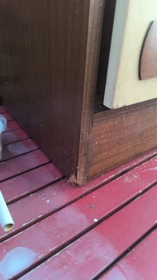 Mueble de madera con un diseño de dos tonos, ideal para proyectos de restauración. - Estructura de madera. - Combinación de colores beige y marrón.