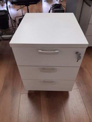 Cajonera de oficina con un diseño moderno y funcional. Su acabado en blanco le da un toque elegante. - Tapa superior con textura de polipiel. - Cajones amplios para almacenamiento. - Cerradura de seguridad en el cajón superior sin llave -metálica con ruedas la tapa de arriba está suelta y le puse cola de impacto se pueden poner tornillos de ahí su precio Alto 54 cm profundidad 54 cm y ancho 42,5 cm es metálica