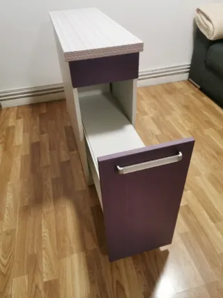 Cajonera con un diseño moderno y funcional. 1.49 abierto del todo. - Acabado superior blanco con vetas. - Cajón frontal en color morado. - Compartimento abierto inferior.