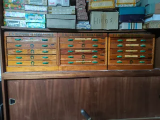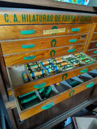 Conjunto de cajoneras de madera, ideales para organizar hilos. - Precio por unidad (se puede hacer descuento por pack) - Cajoneras con tiradores verdes. - Marca Fabra y Coats.