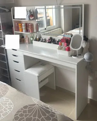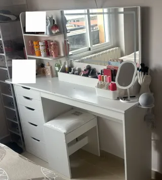 Tocador elegante con espejo integrado y luz LED. - Acabado en blanco. - Diseño moderno. - Amplio espacio de almacenamiento. -Sistema de Iluminación Multifuncional: El espejo de la mesa de maquillaje incorpora una cinta LED con funciones de ajuste de tres tipos de temperatura de luz y brillo. Esto permite satisfacer las necesidades de maquillaje en diversos ambientes, ofreciendo un efecto de luz natural para un maquillaje perfecto -Configuración de Alimentación Conveniente:La mesa viene equipada con una barra de enchufes europea que cuenta con 2 enchufes y 2 puertos USB.