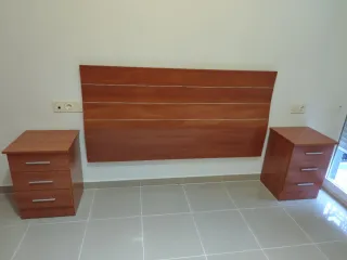 Conjunto de mobiliario para dormitorio. - Cabecero con diseño de líneas horizontales. - Dos mesitas de noche a juego, cada una con tres cajones. - Cajonera / cómoda con 4 cajones. - Espejo a juego.
