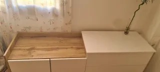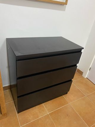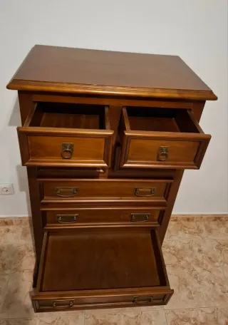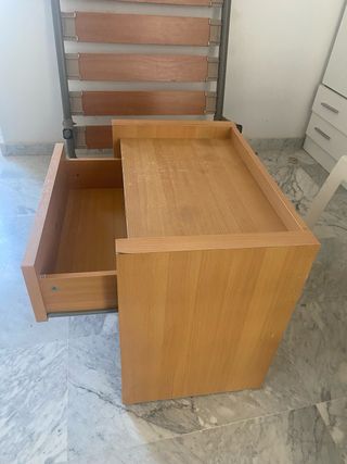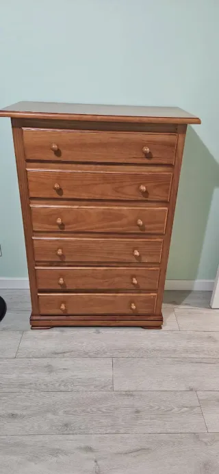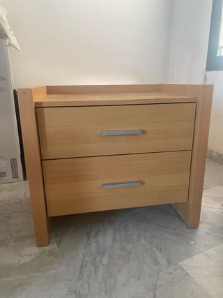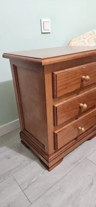 Usado, buen estado. Posibilidad de mesita de noche a juego El interior de los cajones están un poco combados. Pensamos que le falta un refuerzo central que si tiene otra cómoda que tenemos. El refuerzo es un palo de madera fácil de conseguir. Nosotros no llegamos a ponérselo pq a penas lo usamos unos meses.